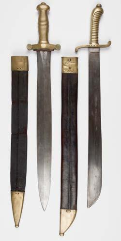440* Third Reich. A WWII German Red Cross enlisted man’s hewer dagger, the 26.5 cm steel sawback blade with straight edge tip stamped ‘Ges Geschutz’, with nickel crossguard bearing the D.R.K.badge, composite black grips (the plain side damaged), flared pommel, overall length 39.5 cm, in its black metal scabbard (1)