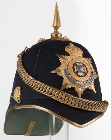 497* Perthshire Regiment. A Victorian officer’s 1869 pattern full dress shako of the 73rd (Perthshire) Regiment Foot, an extremely fine example, the blue cloth body embellished with gold lace indicating the rank of a Captain or below, standard crowned laurels and pierced numerals gilt shako plate, correct pattern rose side ornaments and velvet lined gilt brass chin chain, correct pattern gilt ball with ‘VR’ cypher plume holder and white over red ball tuft, tan sweat band, crimson silk lining with the Corke Patent trade label ‘Hawkes & Co 14 Piccadilly London’, presented on a display stand (1)