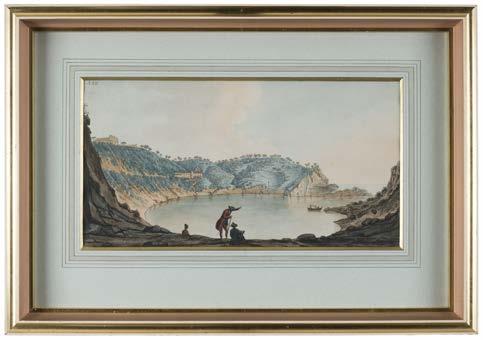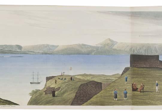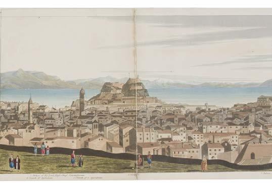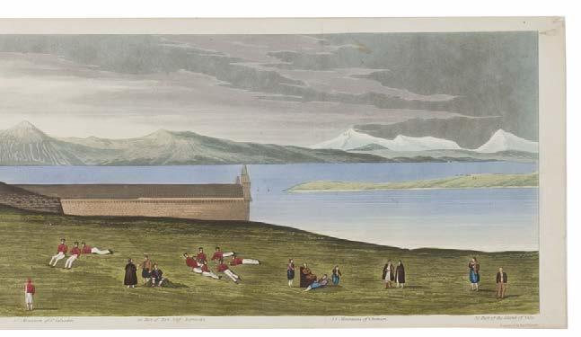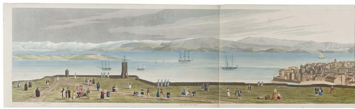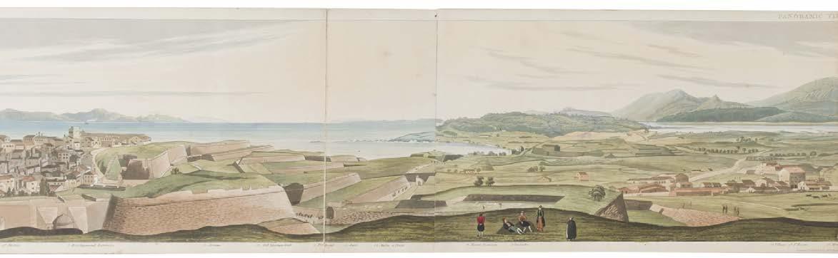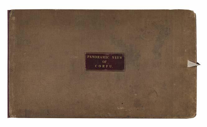 5* Corfu. Havell (Robert), Panoramic View of Corfu, London: published by Robert Havell, August 1st 1836, a 360-degree aquatint panorama after Major Thomas W.O. McNiven, bright contemporary hand colouring, displayed ‘concertina style’ on five conjoined sheets, the lower margin with a key identifying thirty places of interest, one rust mark, very slight wear at folds, 19 x 320 cm, contained in a contemporary cloth portfolio with a morocco gilt title label to the upper siding, spine rebacked and inner retaining flaps and linen ties renewed, portfolio size 240 x 425 mm