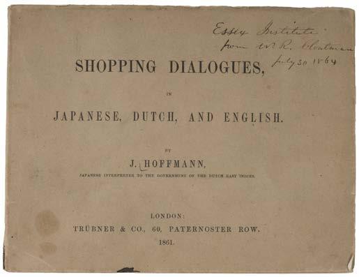 12 Hoffmann (J.). Shopping Dialogues in Japanese, Dutch, and English, by J. Hoffmann, Japanese Interpreter to the Government of the Dutch East Indies, London: Trubner & Co., 1861, partly uncut, ownership inscription of W. R. Cloutman(?) to endpaper, bookplate of Cliff Parfit to front pastedown, original grey paper wrappers (some light toning), near contemporary inscription to upper cover ‘Essex Institute, from W. R. Cloutman(?) July 30 1864’, contained in a custom-made paper covered folding case, oblong 8vo Rare. This work was gifted to the Essex institute (now the Peabody Essex Museum) by W. R. Cloutman. (1)