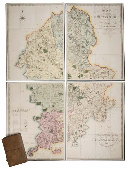 Anon., Britain Triumphant on the Plains of Waterloo, being a correct and circumstantial narrative of that memorable battle..., Burslem: printed by John Tregortha, 1816, hand-coloured folding map frontispiece plus a further map & 4 engraved portraits, inscription dated 1858 to the front pastedown, modern free front & rear endpapers, some toning throughout, rebound modern morocco spine to contemporary full calf boards, slightly rubbed, 8vo, plus Potts (Thomas), Gazetteer of England and Wale:.., 2 volumes, London: printed for F. C. and J. Rivington, et al, 1810, engraved folding map to B1 of volume 1, ex-libris bookplates to the front pastedowns, some very minor marginal toning, contemporary uniform git decorated full calf, some minor marks, 8vo, and other 18th to early 20th Century literature, including ecclesiastical & Staffordshire published reference, many leather bindings, some original cloth, some pamphlets or disbound volumes, overall condition is generally fair to good, 8vo (6 shelves)