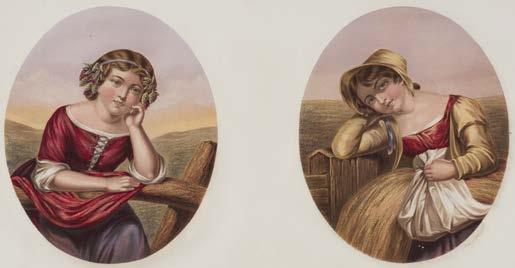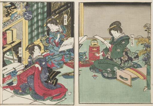 11 Japan. 美人 たち 'Beautiful Woman Peddlers from Chara', circa 1930, 10 woodblock colour illustrations of women artisans, original printed wrappers, 8vo, contained within a custom-made decorated paper-covered box, together with: 'Woman's Etiquette In Pictures', mid 19th century, 12 woodblock colour illustrations depicting women in interior scenes with etiquette instructions in Japanese, bound in Decchōsō style, 8vo, contained within a custommade decorated paper-covered box, plus Marriage Customs in Japan (With Descriptions of the Imperial Wedding), Yokohama: The Eisho Shuppan Sha, 1898, original printed wrappers, 8vo, contained within a custom-made decorated paper-covered box, and 風俗化 粧伝. 佐山半七丸 速水春暁斎 画図 'Miyako fūzoku keshōden, A tale of makeup and customs in the capital', 1922, woodblock illustrations of hairstyle and clothing examples, original green wrappers, 8vo, contained within a custom-made decorated paper-covered box (4)