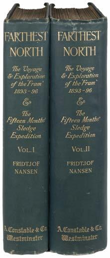 448 Nansen (Fridtjof). “Farthest North”..., 2 volumes, 1st edition, London: Archibald Constable and Company, 1897, 4 colour folding maps to the rears, numerous colour & monochrome illustrations, ex-libris bookplates to the front pastedowns, some light marginal toning, original uniform gilt decorated green cloth, spines slightly rubbed & toned with a small puncture hole to volume 1, 8vo, together with: