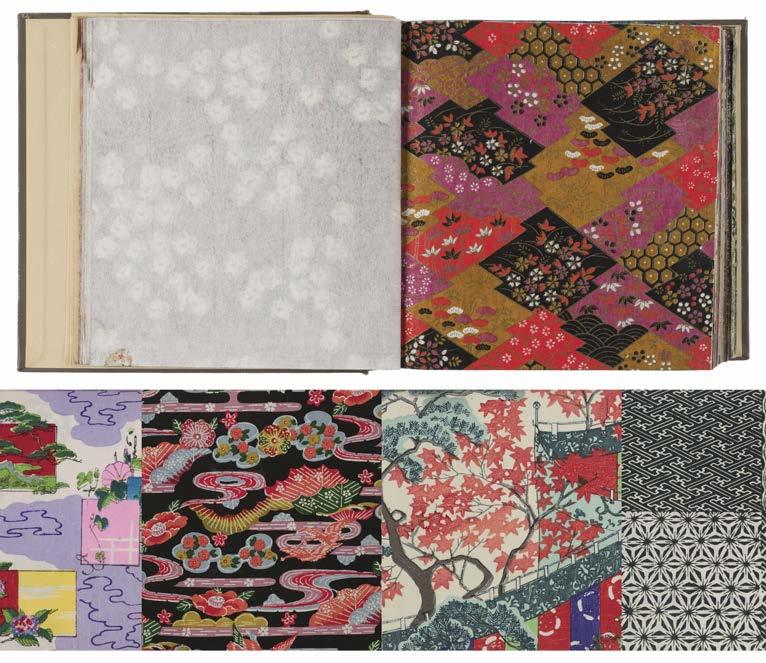 13 Japanese Fabric and Pattern Samples. circa 1880, approximately 200 dyed or patterned wool or cloth samples, each 5 x 4 cm, displayed in 38 pp. washi booklet, with manuscript annotations in Japanese, some closed tears, some samples missing, 37 x 14 cm, contained within a custom-made decorated paper-covered box, together with: Furuya (Kōrin). 古谷紅麟, Shima Shima: Volume 1 [chosakusha Furuya Kōrin], Kyōto: Yamada Unsōdō, 1906, colour illustrations of textile patterns and designs, original colour printed paper wrappers, large 8vo, contained within a custom-made decorated paper-covered box, plus Izumi (Kojiro). Japanese Carpentry, 2 volumes, Yasujiro Mata: 1894, woodblock illustrations of joinery examples and patterns, oblong 12mo, contained within a custom-made decorated paper-covered box, and 繊維製造方法 'Textile Manufacturing Method', Hui Textile Magazine, May 1933, with window-mounted fabric samples, bookplate of Cliff Parfit to front pastedown, original patterned fabric-covered boards, large 8vo, contained within a custom-made decorated paper-covered box (4)