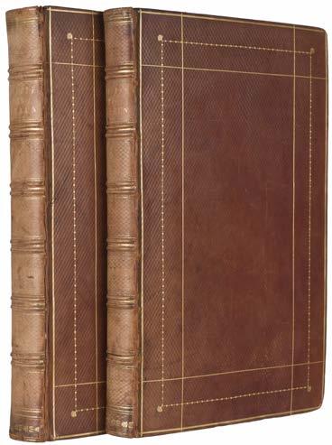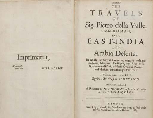 9 Herbert (Thomas). A Relation of some yeares Travaile, begunne anno 1626. Into Afrique and the greater Asia, especially the Territories of the Persian Monarchie: and some parts of the Orientall Indies, and Iles adiacent. Of their Religion, Language, Habit, Discent, Ceremonies, and other matters concerning them. Together with the proceedings and death of the three late Ambassadours: Sir D.C. Sir R.S. and the Persian Nogdi-Beg: as also the two great Monarchs, the King of Persia, and the Great Mogol. By T.H. Esquier, London: printed by William Stansby, and Jacob Bloome, 1634, additional engraved title page entitled ‘A discription of the Persian monarchy .. By Th: Herbert Esq[uire]’ with early ownership signatures to margins at head and foot, numerous engraved illustrations and plans, without first leaf [A1] (blank), with final leaf 2H4 present (colophon), lower outer blank corner of 2D2 torn, few leaves with repaired closed tears mostly to margins (long closed tear to B4 at gutter), some toning, occasional light dust-soiling, minor spotting and few marks, front endpaper with copious 19th-century manuscript notes, upper pastedown with ownership label of E. Calvert of Walton-le-Dale to upper outer corner, contemporary blind panelled calf, modern reback with red morocco title label, board corners worn and showing, board edges rubbed, small folio ESTC S119687; STC 13190; Sabin, 31471.