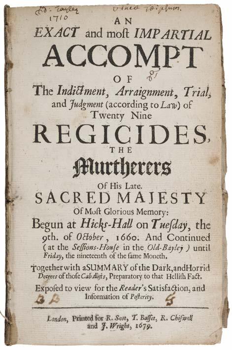 395 [Finch, Heneage]. An Exact and most Impartial Accompt of the Indictment, Arraignment, Trial, and Judgement (According to Law) of Twenty Nine Regicides, the Murtherers of His Late Sacred Majesty of Most Glorious Memory: Begun at Hicks-Hall on Tuesday, the 9th. of October, 1660. And continued (at the Sessions-House in the Old Bayley) until Friday, the nineteenth of the same Moneth. Together with a summary of the dark and horrid decrees of those caballists, prepatory to that hellish fact, 2nd edition, London: printed for R. Scot, T. Basset, R. Chiswell and J. Wright, 1679, imprimatur leaf (detached), one or two short marginal tears, occasional light toning, previous owner inscription at head of title dated 1710, disbound, 8vo, together with Hamilton (William). The Life and Character of James Bonnell Esq; Late Accomptant General of Ireland. To which is added the sermon preach’d at his funeral by Edward, Lord Bishop of Killmore and Ardagh, 1st edition, Dublin: printed for Jo. Ray, 1703, 2nd issue with separate title and pagination, lacking the portrait frontispiece and errata leaf, a few contemporary annotations, a few small wormholes and light marginal damp stains, disbound, 8vo, together with other antiquarian literature, poetry, sermons, periodicals etc, all disbound in varying condition including Edmund Burke’s Reflections on the Revolution in France, 1st Dublin edition, 1790, Convention Between His Britannick Majesty and the Empress of Russia. Signed at London, the 25th of March 1793, Poems for Young Ladies in Three Parts, Devotional, Moral and Entertaining, by Oliver Goldsmith, 1st edition, 1767 (lacking frontispiece), The Duel of the Stags, by Sir Robert Howard. Together with an Epistle to the Author by John Dryden, 1709, Décret de la Convention Nationale, du 16 Décembre 1792, l’an 1.et de la République Française, and The Royal NavyMen’s Advocate. Wherein, from a collection of several original and authentic tracts, are fully set forth the corrupt practices of victualling the Royal Navy, by William Thompson, 1757 (ex-libris)