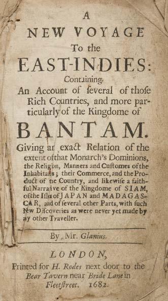 7 Glanius (W.) A New Voyage to the East-Indies: Containing an account of several of those rich countries, and more particularly of the Kingdome of Bantam, 1st edition, London: printed by H. Rodes, 1682, lacking the portrait frontispiece and pp. 123-142, a few tears and wormtracks, some damp stains, frayed fore-edges and dust-soiling, leaves detached and disbound, 12mo ESTC R21683; Wing G793