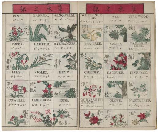 10 Na (Sudo). Picture book with Japanese-English translation, 1887, multiple woodblock colour illustrations with accompanying translations in Japanese and English, including images of fish, birds, plants and flowers, vegetables, insects, household objects and others, original yellow paper wrappers, 8vo, contained within a custom-made decorated paper-covered box, together with: Benwell (C. M.). Easy Conversations for Ladies in English and Japanese, Tokyo, Osaka and Kioto: 1889, Cliff Parfit bookplate to front free endpaper, some holes to leaves where stapled, joints weak, printed boards, some toning, 12mo, contained within a custom-made decorated paper-covered box, 'English for Daily Use'.