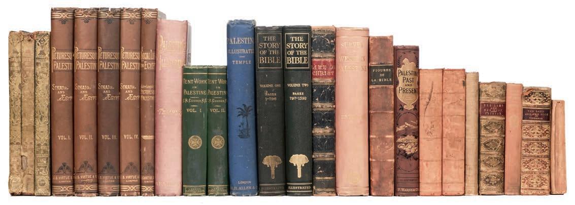 13 Carne (John). Syria, The Holy Land, Asia Minor, 3 volumes, London: Fisher & Son, [1836], 120 steel-engraved plates, contemporary ownership inscription to volume 3 front free endpaper, lightly spotted, lithograph title to volume 1 loose, original green cloth gilt, all edges gilt, head and tail of volume 3 backstrip worn, rubbed, 8vo, together with: Wilson (Charles). Picturesque Palestine, Sinai and Egypt, 5 volumes, London: J.S. Virtue & Co, [1880], 48 steel engravings including frontispieces and additional titles, further wood engravings to text, occasional light spotting, original brown cloth gilt, all edges gilt, volume 5 front joint split to head, rubbed, 4to, with Temple (Richard). Palestine Illustrated, London: W H Allen, 1888, 4 maps (2 double-page). 32 chromolithographs, 2 lithographs, preliminary leaves spotted, one plate loose, original purple cloth gilt, backstrip faded, lightly rubbed, 8vo, with 16 others related to Palestine (25) £300 - £400
