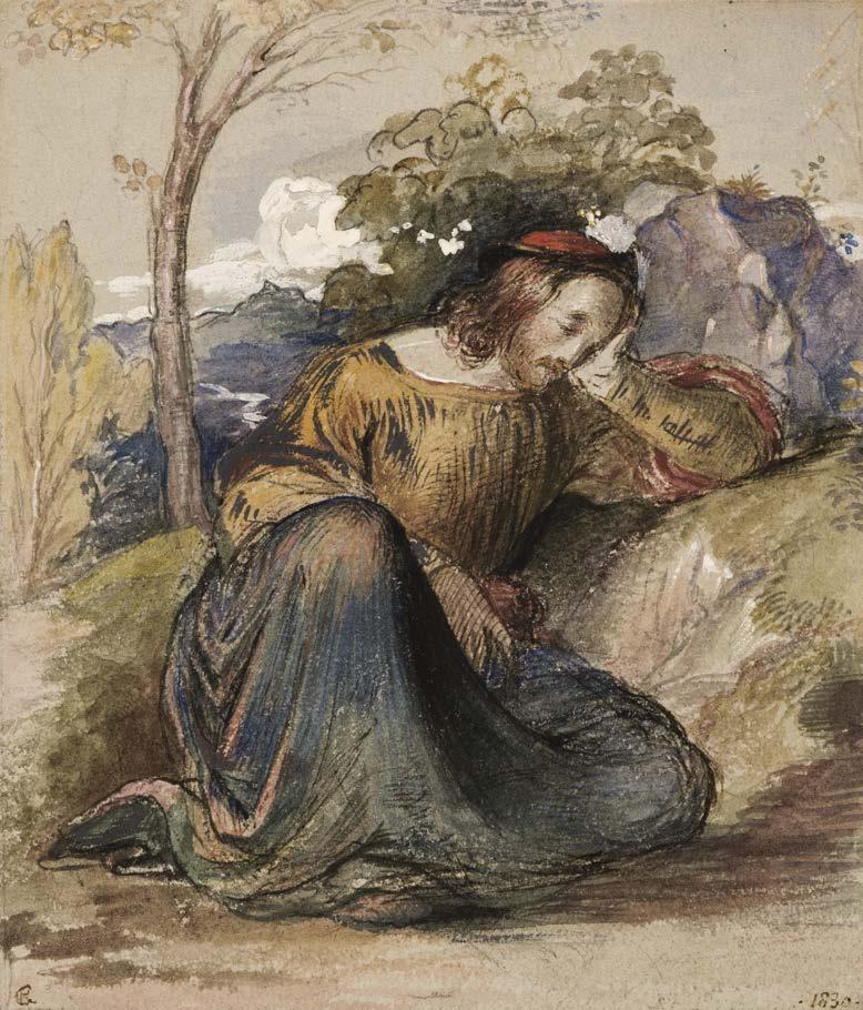A rare work from the early period of George Richmond's career, executed just before the artist's elopement with Julia Tatham. Richmond enrolled at the Royal Academy at the age of 15, where he met Samuel Palmer, and at 16 was introduced to William Blake. Their meeting had a profound effect on the young artist, and in 1824 Richmond, along with Palmer, Edward Calvert, Frederick Tatham, and others, formed the Blakeinfluenced group known as 'The Ancients'. The figure in the present work may well have been modelled on Samuel Palmer, who was known to dress in unconventional ‘revivalist’ clothing.