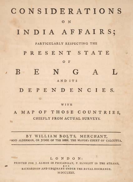 8 Bolts (William). Considerations on India Affairs; particularly respecting the present state of Bengal and its dependencies, with a map of those countries, chiefly from actual surveys, 1st edition, 2 volumes, London: J Almon, 1772-75, folding map of Bengal, armorial bookplate of ‘Geo. Lord Macartney’ to front pastedowns, some toning and dust-soiling, front free endpaper of first volume loose, contemporary calf gilt, worn, front boards detached, 4to Provenance: George McCartney, first envoy of Britain to Qing China, Governor of Grenada (1776-79), Governor of Madras (1781-85), Governor of Cape Colony (1797-98).