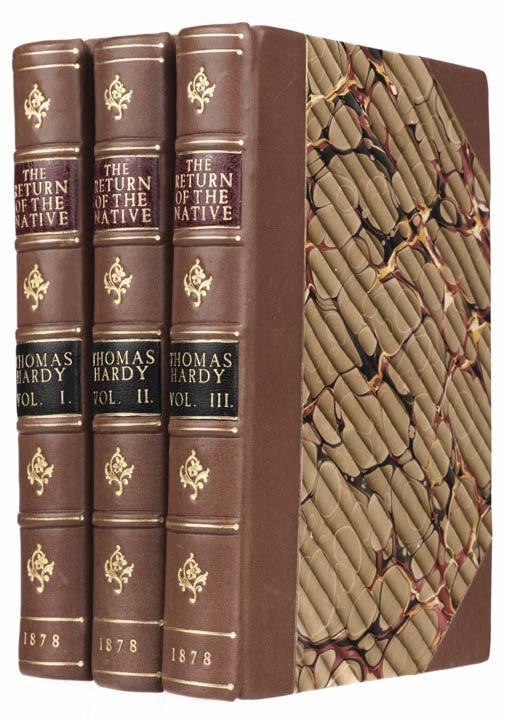 453 Hardy (Thomas). The Return of the Native, 3 volumes, 1st edition, London: Smith, Elder & Co., 1878, half-titles, small marginal repair to volume I half-title and final leaf, small marginal repair to last leaf of volume II and to gutter and outer margins of pp. 315-320 in volume III, a few minor marks, top edge gilt, recent brown half calf by Francis Brown, Dorchester, spines with raised bands, morocco labels and gilt decorations, contained in cloth slipcase, 8vo