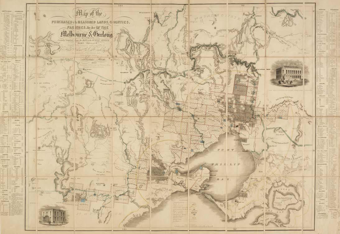 An extremely rare and important map showing how Melbourne and Geelong districts were divided and sold to settlers in the middle of the 19th century. WorldCat lists only four institutional copies, all in Australia. We can find no records of this map appearing at auction. The map shows southern Victoria with relief shown by hachures. It includes a list of sections, purchasers and acreage in each county, special surveys and other cadastral information.