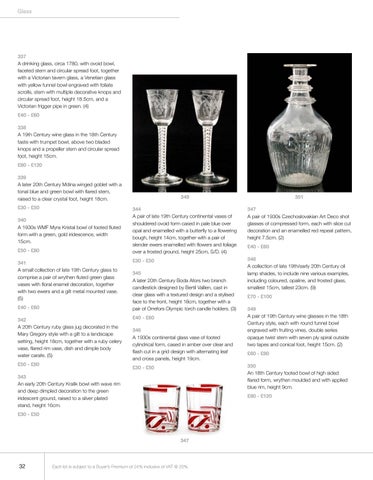 337 A drinking glass, circa 1780, with ovoid bowl, faceted stem and circular spread foot, together with a Victorian tavern glass, a Venetian glass with yellow funnel bowl engraved with foliate scrolls, stem with multiple decorative knops and circular spread foot, height 18.5cm, and a Victorian frigger pipe in green. (4) £40 - £60 338 A 19th Century wine glass in the 18th Century taste with trumpet bowl, above two bladed knops and a propeller stem and circular spread foot, height 15cm. £80 - £120 339 A later 20th Century Mdina winged goblet with a tonal blue and green bowl with flared stem, raised to a clear crystal foot, height 18cm. £30 - £50 340 A 1930s WMF Myra Kristal bowl of footed fluted form with a green, gold iridescence, width 15cm. £50 - £80 341 A small collection of late 19th Century glass to comprise a pair of wrythen fluted green glass vases with floral enamel decoration, together with two ewers and a gilt metal mounted vase. (5) £40 - £60 342 A 20th Century ruby glass jug decorated in the Mary Gregory style with a gilt to a landscape setting, height 18cm, together with a ruby celery vase, flared rim vase, dish and dimple body water carafe. (5) £50 - £80