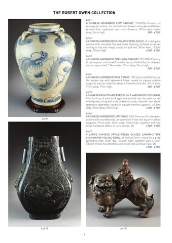 THE ROBERT OWEN COLLECTION Lot 1 A CHINESE ROSEWOOD LOW CABINET, 19th/20th Century, of rectangular outline, the central short drawer and cupboard flanked by twin-door cupboards over short drawers, 137cm wide, 46cm £80 - £120 deep, 56cm high. Lot 2 A CHINESE HARDWOOD SCHOLAR’S OPEN SHELF, of rectangular outline with moulded top and sides framing multiple recesses varying in size and shape, raised on pad feet, 90cm wide, 13.5cm £100 - £150 deep, 106cm high. Lot 3 A CHINESE HARDWOOD OPEN LOW CABINET, 19th/20th Century, of rectangular outline with central recess flanked by box drawers over an open shelf, 124cm wide, 32cm deep, 56cm high. £80 - £120 Lot 4 A CHINESE HARDWOOD VASE STAND, 19th Century/20th Century, the square top with openwork frieze raised on square section supports with an undertier above a fretwork stretcher, 39cm wide, £80 - £120 39cm deep, 77cm high. Lot 5 A CHINESE PAINTED AND PARCEL GILT HARDWOOD SIDE CHAIR, 19th Century, of yoke back type and painted red, the splat carved with figures, a stag and a bat picked out in gilt, the plain seat above openwork spandrels raised on square-section supports, 40.5cm wide, 35cm deep, 87cm high. £100 - £150 Lot 6 A CHINESE HARDWOOD LOW TABLE, 20th Century, of rectangular outline with rounded ends, an openwork frieze and square section supports, 95cm wide, 48cm deep, 35cm high, together with two small hardwood tables or curio stands. (3) £100 - £150