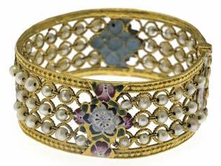 19 A Continental yellow metal enamel and pearl bangle bracelet, AF, inner diameter 5.5cm, width 2.3cm, 47.2g £200 - £400