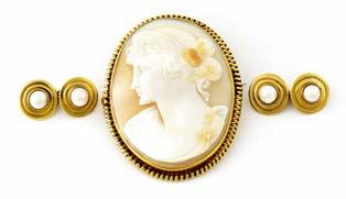 17 A cameo brooch and pair of cultured pearl cufflinks, length of brooch 5.6cm, length of cufflink face 1.2cm, 21.7g. £300 - £400