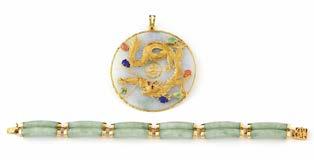 18 A jade and gem-set pendant and bracelet, both with Chinese character detail, both stamped 14K 585, length of pendant 6.8cm, 28g, length of bracelet 18cm, 22.7g. £150 - £250