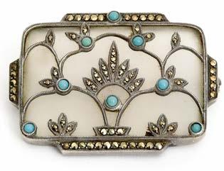 33 A Continental Art Deco silver and turquoise brooch, pierced rectangular form, with frosted glass back, modelled as a stylised flower amongst arches, set with tiny turquoise stones and paste chips, stamped marks, 925, 4cm. wide