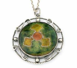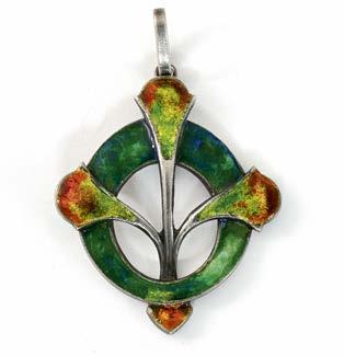 24 Archibald Knox for Liberty and Co, an Arts and Crafts silver and enamelled pendant, John Baker Bennett, ring and trefoil frond form, in green and red enamel, 4cm long, 4.4g £120 - £150