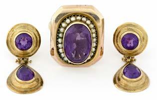 5 A pair of 9ct gold amethyst drop earrings and an amethyst and split pearl cluster ring, earrings with hallmarks for Birmingham, 1992, length of earrings 3.5cm, ring size L1/2, 20.3g. £500 - £700