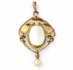23 Archibald Knox for Liberty and Co, an Arts and Crafts 9 carat gold and pearl pendant, John Baker Bennett, open knotted and coiled wire tendril cartouche with stylised kidney leaf motifs around a central mother of pearl oval plaque, a Baroque pearl drop below, 4.5cm long, 3.7g £300 - £500 24