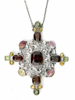 21 Amy Sandheim, a large Arts and Crafts silver and gem set cruciform pendant necklace, circa 1920, cast with reticulated foliate and fruting vines and set with multi coloured baguete and cabochon stones including brown zircon, tourmaline cabochons and facet cut quartz, on a double chain of knotted and cable links, 7.5cm, 25.3g £400 - £600