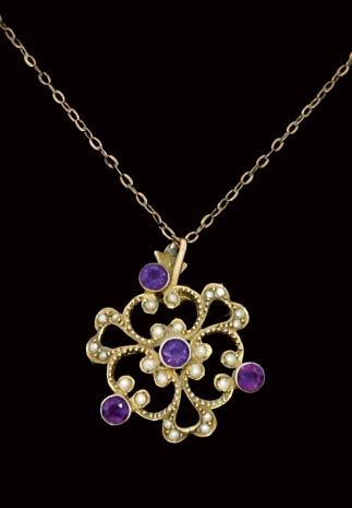 9 An Edwardian 9ct gold amethyst and split pearl openwork pendant, with chain, both stamped 9ct, length of pendant 3.5cm, length of chain 42cm, 4.5g. £120 - £180