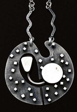 28 An Arts and Crafts silver and agate necklace, the central polished oval stone within a ropetwist frame, surmounted by coiled wire and conjoined ring, suspended on quatrefoil and round link chains, 5cmm 43.5cm long, 16.7g £120 - £150