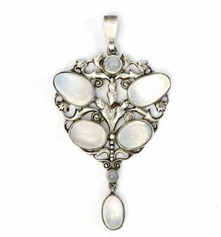 25 Liberty and Co., a silver and moonstone pendant, circa 1917, cast and reticulated with Renaissance style foliate scrolls and set with graduated cabochons, 5.5cm long, 5.2g