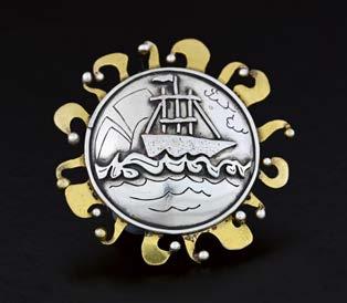 34 A Scandinavian silver and gilt metal target brooch, mid 20th Century, depicting a triple mast sailing ship on choppy seas, unmarked, 5cm diameter