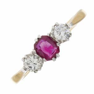 71 An 18ct gold and platinum, ruby and brilliant-cut diamond three-stone ring, estimated total diamond weight 0.30ct, H-I colour, SI clarity, ruby estimated weight 0.35ct, band stamped 18c Plat, ring size M1/2, 2.2g £200 - £300
