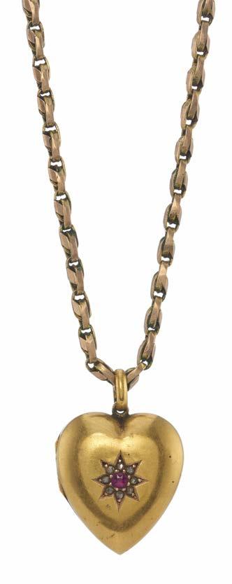 19 A late Victorian 15ct gold ruby and rose-cut diamond heart-shape locket pendant, suspended from a yellow metal chain, locket stamped 15ct, clasp stamped 9ct, length of pendant 2.8cm, length of chain 41cm, total weight 12.2g £300 - £500