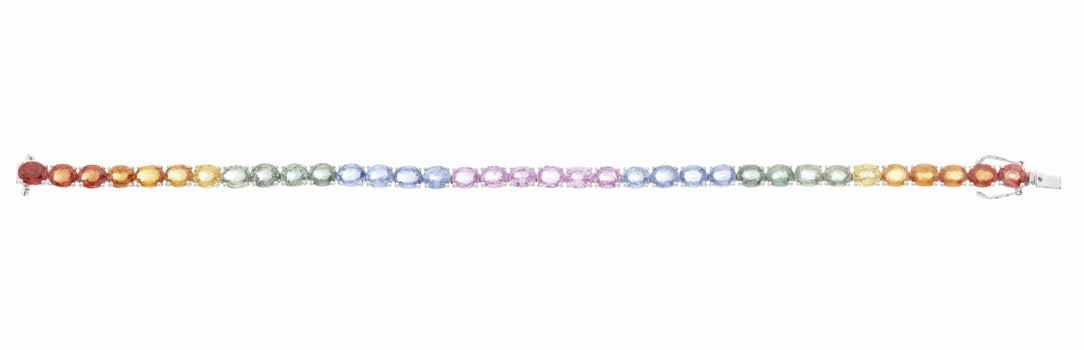 69. An 18ct gold harlequin vari-hue sapphire line bracelet, with partially concealed push-piece clasp, estimated total sapphire weight 16.10ct, length 17.5cm, 14.5g £1,500 - £2,000