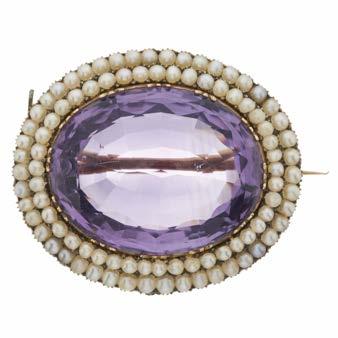 6 A 19th century yellow metal amethyst and split pearl brooch, amethyst estimated weight 55ct, may also be worn as a pendant, length 4.5cm, 24.6g £200 - £400