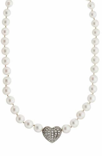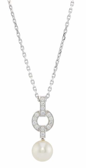 51. Car tier, an 18ct gold cultured pearl and brilliant-cut diamond Himalia pendant, suspended from an 18ct gold chain, signed Cartier, serial PA3946, estimated total diamond weight 0.30ct, G-H colour, VS clarity, stamped 750, length of pendant 2.7cm, length of chain 42cm, 9.1g £1,500 - £2,000