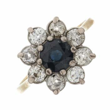 14. An early to mid 20th century 18ct gold and platinum, cushion-shape sapphire and old-cut diamond cluster ring, sapphire estimated weight 0.65ct, estimated total diamond weight 0.40ct, H-I colour, SI clarity, band stamped 18ct plat, ring size P1/2, 2.7g