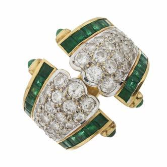 63. An 18ct gold emerald and brilliantcut diamond dress ring, emerald estimated weight 1.50ct, estimated total diamond weight 0.80ct, G-H colour, SI clarity, band stamped 750, ring size M1/2, 6.4g £500 - £800