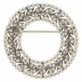 16 An Edwardian white metal single-cut diamond and seed pearl wreath brooch, estimated total diamond weight 0.70ct, H-I colour, SI clarity, diameter 3.6cm, 8.5g £150 - £250