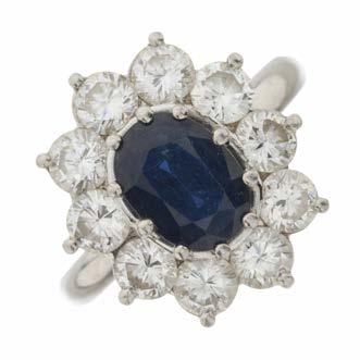 73. An 18ct gold sapphire and brilliantcut diamond cluster ring, estimated total diamond weight 0.70ct, H-I colour, SI2-P1 clarity, stamped 18ct, ring size N1/2, 4.4g
