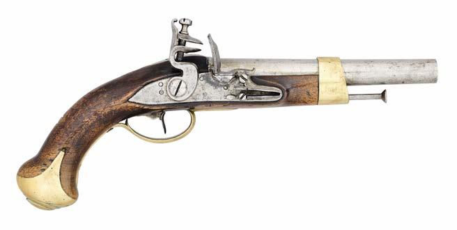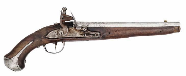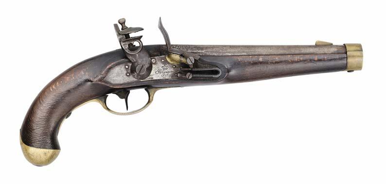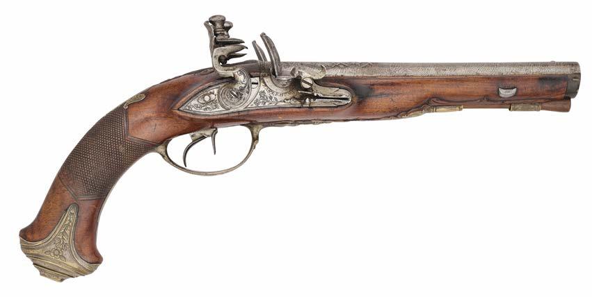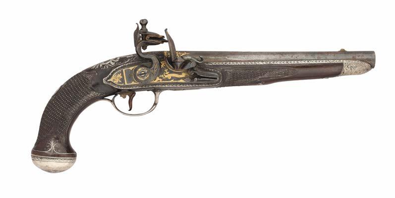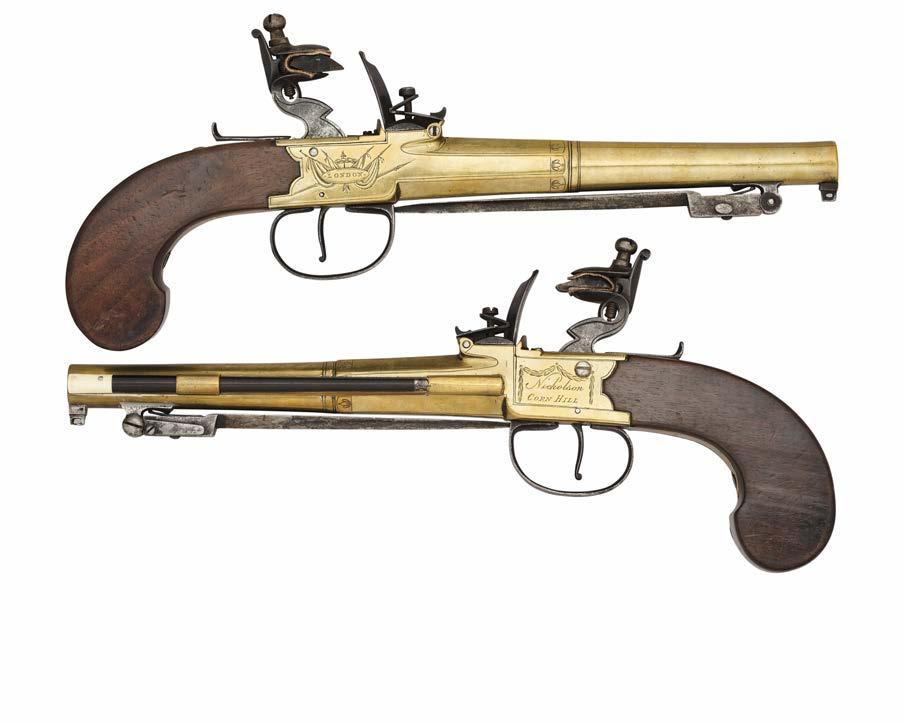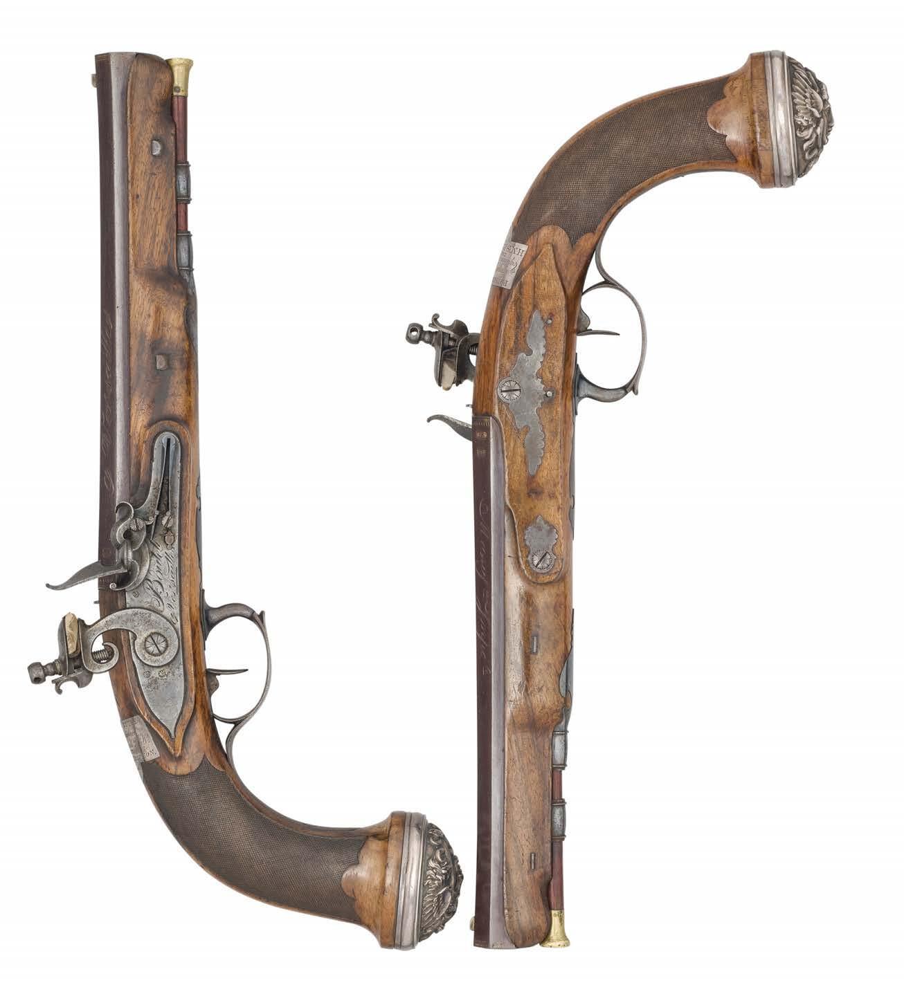 A CASED PAIR OF 35 BORE FLINTLOCK TRAVELLING OR OVERCOAT PISTOLS BY H.W. MORTIMER & SON, LONDON, GUN-MAKER TO HIS MAJESTY, NO. 1365, CIRCA 1812 with rebrowned octagonal sighted barrels each signed along the top flat, engraved with a line of foliage at the rear, with gold-lined touch-hole and struck with London proof marks and barrelsmith’s mark of Harvey Walklate 1 Mortimer, engraved tangs each with back-sight, signed border engraved flat locks each decorated with a starburst behind the pan and with a par t martial trophy beneath the blued safety-catch, foliate engraved ‘French’ cocks , blued rollers, figured full stocks each with pineapple chequered rounded butt, the pommels cut with radiating lines, blued trigger-guards each with pineapple finial and with maker’s address in an oval against a martial trophy on the border engraved bow, silver barrel-bolt escutcheons, blued slotted ramrod-pipes, and original copper-alloy mounted ramrods each with threaded cap over the worm: in their mahogany case fitted and lined in navy blue velvet with accessories including brass-mounted three-way powder-flask, the interior of the lid with trimmed trade label of Edward Patrick, the exterior with escutcheon plate incorporating a flush-fitting carr ying handle, 10.0 cm barrels