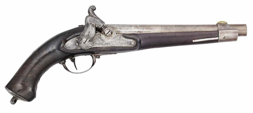 with blued octagonal sighted barrel, topstrap stamped ‘AO’ in an oval, an anchor between, blued cylinder stamped ‘C’ on an anchor in an oval, blued frame lightly engraved with foliage and stamped with the same mark on one side, border engraved back-action lock stamped with the same mark as the top-strap, patent rammer (arbor-catch missing), trigger-guard and butt-cap, the latter numbered ‘33’ and with lanyard ring, chequered rounded butt (old wear) numbered en suite, and retaining some of its finish, 14.5 cm barrel