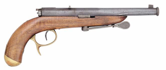 with blued octagonal sighted rifled barrel engraved with vine leaves around the muzzle, and stamped with maker’s mark on one side in front of the cylinder, border engraved case-hardened cylinder, frame and trigger-guard all decorated with vine leaves inhabited by a bird on one side of the frame, sprung trigger-stop on the inside of the guard, blued trigger, hinged loading-lever and engraved hammer, chequered figured rounded butt with case-hardened ovoidal butt-cap engraved with foliage centred on the retaining screw, and in fine condition retaining nearly all its original finish, 15.3 cm barrel