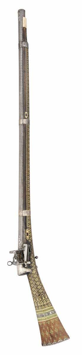 with two-stage slightly swamped copper-alloy barrel turned at the girdle, engraved ‘LONDON’ along the top flat of the octagonal breech and with a line of repeated foliage at the rear, and struck with London proof marks, border engraved tang decorated with foliage, signed flat bevelled lock with roller, figured full stock (old split in the ramrod channel at the muzzle) with pineapple chequered rounded butt, copper-alloy mounts comprising trigger-guard with large pineapple finial and decorated with a flower-head on the border engraved bow, turned ramrod-pipes, and horn-tipped ramrod with iron worm, 20.0 cm barrel