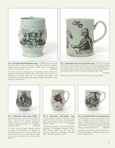 534. A Longton Hall bell-shaped mug, c.1758-60, printed in black with the arms of the Ancient and Honourable Society of Bucks, signed ‘Sadler Liverpool’, between smaller prints of Justice and Fame, some damages, 12.5cm. £400-600 The print is after an engraving by H Copeland, dated 1748 and is attributed to Jeremiah Evans. The same print can be found on Worcester porcelain and also on Liverpool porcelains and creamwares. It is likely that Sadler bought Longton Hall blanks in the last years of the factory.