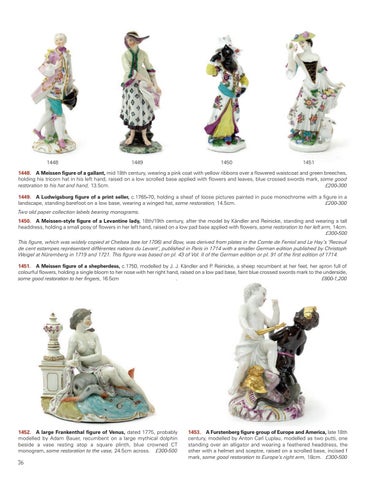 1448. A Meissen figure of a gallant, mid 18th century, wearing a pink coat with yellow ribbons over a flowered waistcoat and green breeches, holding his tricorn hat in his left hand, raised on a low scrolled base applied with flowers and leaves, blue crossed swords mark, some good restoration to his hat and hand, 13.5cm. £200-300 1449. A Ludwigsburg figure of a print seller, c.1765-70, holding a sheaf of loose pictures painted in puce monochrome with a figure in a landscape, standing barefoot on a low base, wearing a winged hat, some restoration, 14.5cm. £200-300 Two old paper collection labels bearing monograms. 1450. A Meissen-style figure of a Levantine lady, 18th/19th century, after the model by Kändler and Reinicke, standing and wearing a tall headdress, holding a small posy of flowers in her left hand, raised on a low pad base applied with flowers, some restoration to her left arm, 14cm. £300-500 This figure, which was widely copied at Chelsea (see lot 1706) and Bow, was derived from plates in the Comte de Ferriol and Le Hay’s ‘Receuil de cent estampes représentant différentes nations du Levant’, published in Paris in 1714 with a smaller German edition published by Christoph Weigel at Nüremberg in 1719 and 1721. This figure was based on pl. 43 of Vol. II of the German edition or pl. 91 of the first edition of 1714. 1451. A Meissen figure of a shepherdess, c.1750, modelled by J. J. Kändler and P. Reinicke, a sheep recumbent at her feet, her apron full of colourful flowers, holding a single bloom to her nose with her right hand, raised on a low pad base, faint blue crossed swords mark to the underside, £800-1,200 some good restoration to her fingers, 16.5cm .