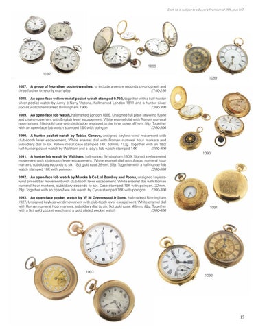 1088 1087 1089 1087. A group of four silver pocket watches, to include a centre seconds chronograph and three further time-only examples £150-250 1088. An open-face yellow metal pocket watch stamped 0.750, together with a half-hunter silver pocket watch by Army & Navy Victoria, hallmarked London 1911 and a hunter silver pocket watch hallmarked Birmingham 1906 £200-300 1089. An open-face fob watch, hallmarked London 1886. Unsigned full plate key-wind fusée and chain movement with English lever escapement. White enamel dial with Roman numeral hourmarkers. 18ct gold case with dedication engraved to the inner cover. 41mm, 58g. Together with an open-face fob watch stamped 18K with poinçon £200-300 1090. A hunter pocket watch by Tobias Geneve, unsigned keyless-wind movement with club-tooth lever escapement, White enamel dial with Roman numeral hour markers and subsidiary dial to six. Yellow metal case stamped 14K. 53mm, 113g. Together with an 18ct half-hunter pocket watch by Waltham and a lady’s fob watch stamped 14K £600-800 1091. A hunter fob watch by Waltham, hallmarked Birmingham 1909. Signed keyless-wind movement with club-tooth lever escapement. White enamel dial with Arabic numeral hour markers, subsidiary seconds to six. 18ct gold case 38mm, 55g. Together with a half-hunter fob watch stamped 18K with poinçon £200-300