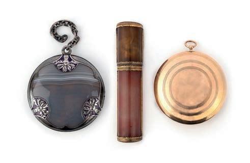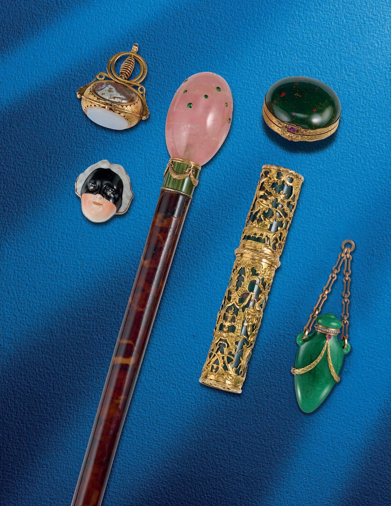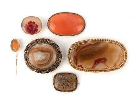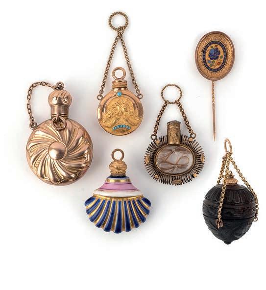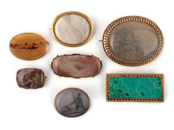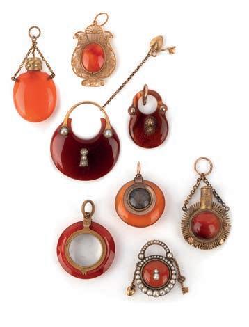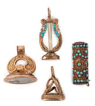 43 A group of seven charms and a stick pin, 19th century, comprising: five mother of pearl charms including a lute, a bag, two wicker baskets, a boot and a wagon, longest 3.2cm; together with a jasper vinaigrette pendant; and a mother of pearl and turquoise stick pin designed as a dragoon’s helmet, length 8.3cm £50-100
