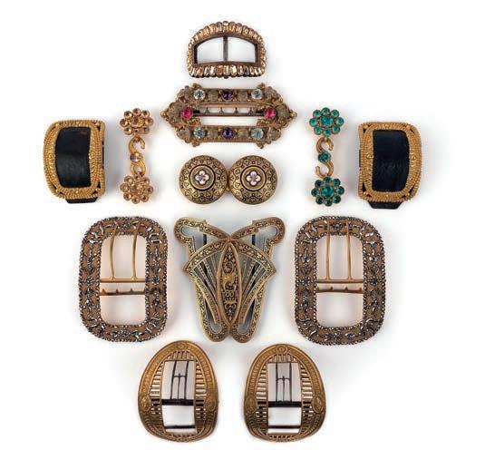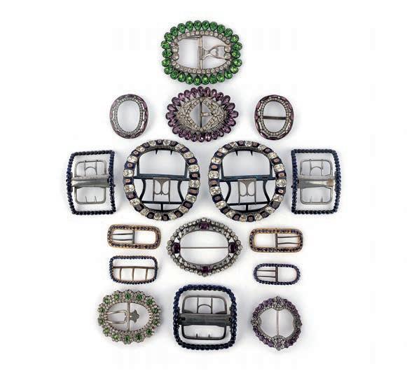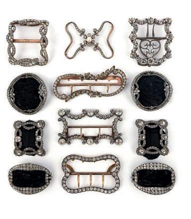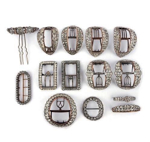 24 A collec ti on of paste shoe buckles, brooches and a hair ornament, late 18th/early 19th century, comprising: two pairs of buckles set with colourless pastes; together with six assorted buckles, variously set with colourless pastes, mounted in silver and base metal; largest 9.5 4.9cm; together with three brooches and a hair ornament, each set with colourless pastes £200-300