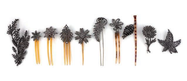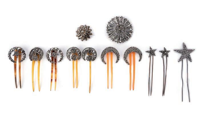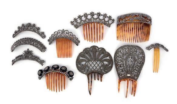 λ 8 A collection of cut steel hair ornaments, 19th century, comprising: ten hair ornaments; including seven with tortoiseshell comb fittings, each of various designs in cut steel, largest measuring 15.8 x 9.8cm, two tortoiseshell fittings broken £200-300